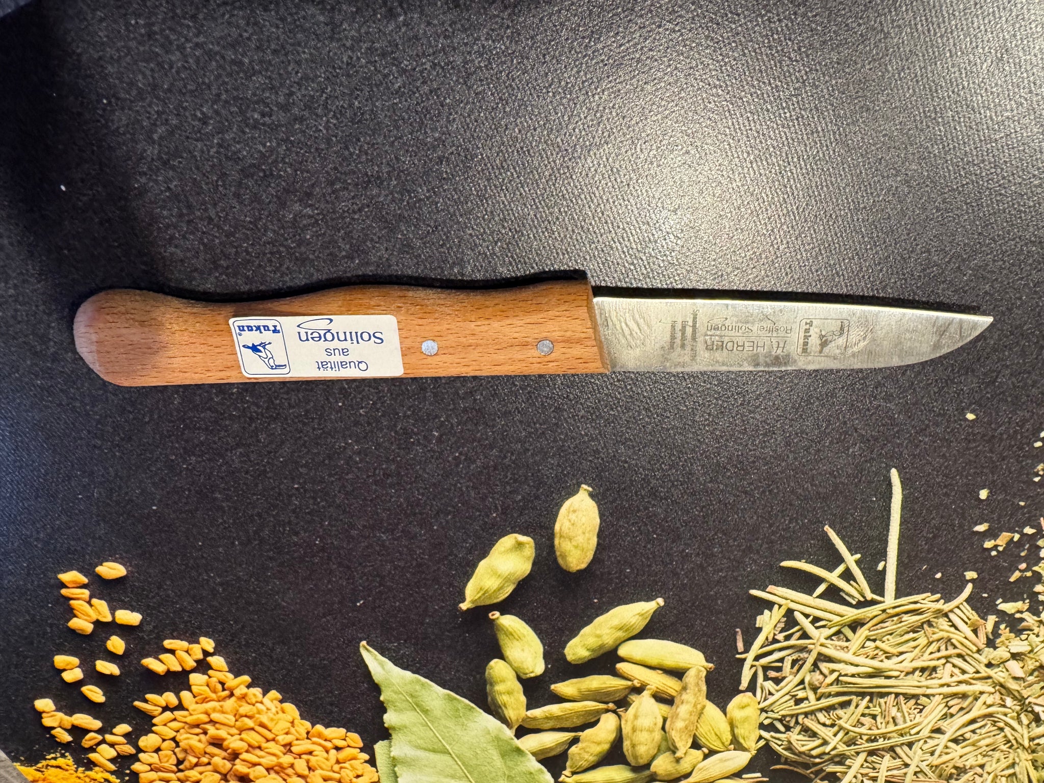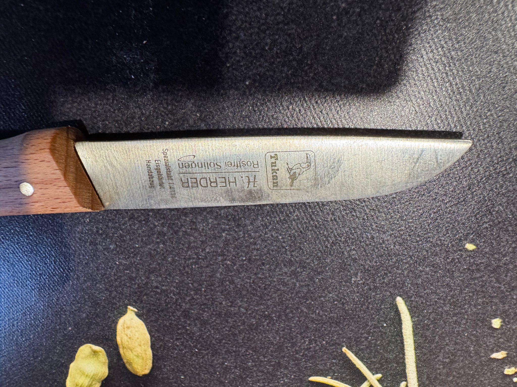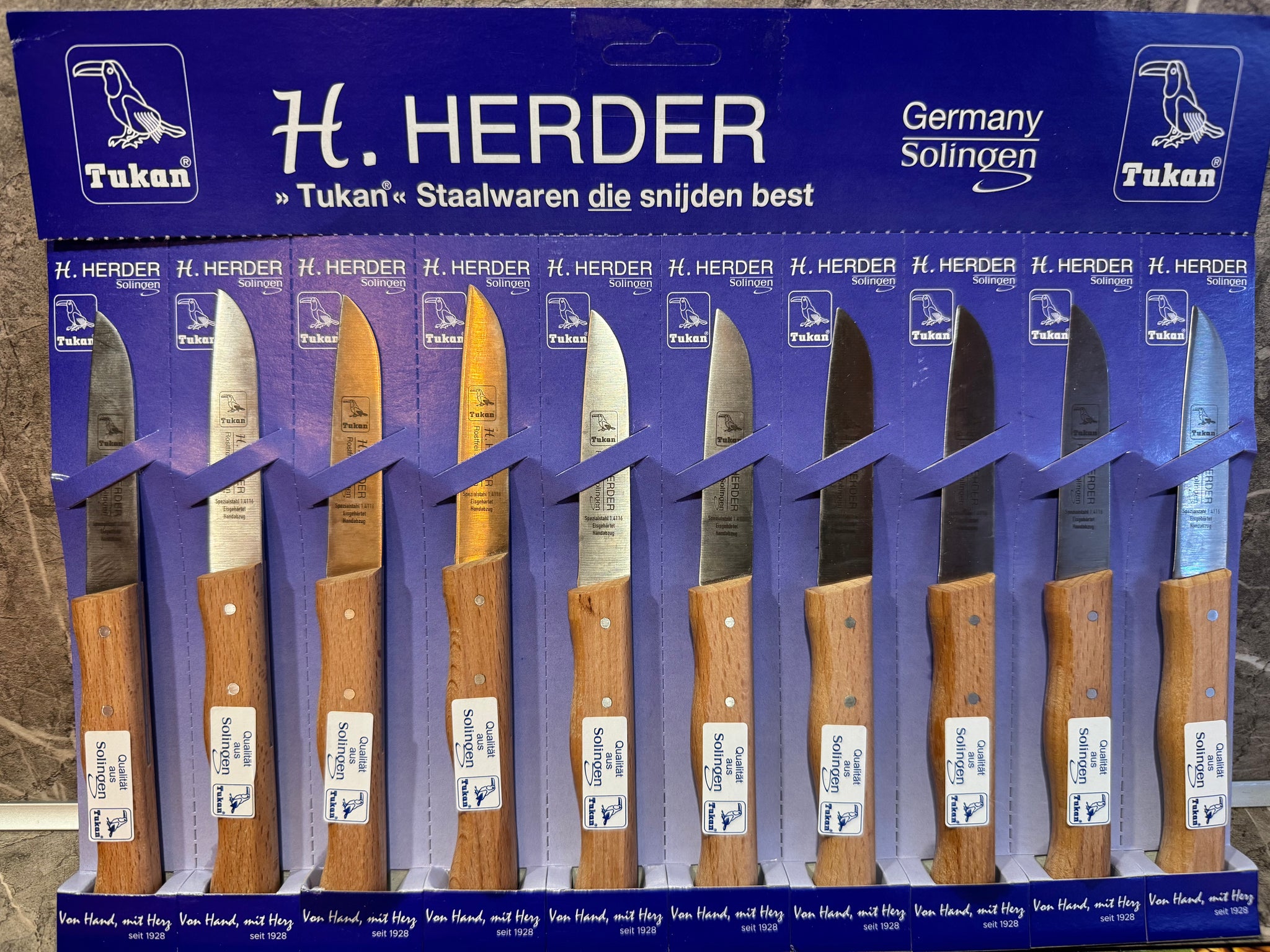 Herder schilmessen staan wereldwijd bekend om de enorm scherpe kwaliteit! Een Herder schilmesje wordt gesmeed in Solingen, waar de beste messen en scharen ter wereld al honderden jaren ambachtelijk gesmeed worden. De schilmessen van Herder zijn echt handwerk en worden met de grootste aandacht vervaardigd, geslepen, gepolijst en altijd aan een strenge kwaliteitskeuring onderworpen. Dit schilmesje is krom en niet-roestvrij, waardoor het mes vele malen scherper is en blijft dan wanneer het een behandeling heeft gehad om het mes vrij van roest te houden. Spoel het mesje meteen na gebruik eventjes af met heet, schoon water, droog het goed af met de theedoek en leg het direct terug in de keukenla. Bij het opvolgen van dit onderhoudsvoorschrift zal je jaren plezier hebben van dit mesje. Afmeting: Lemmet 7,5 cm ; Handvat: 10cm. Model: recht