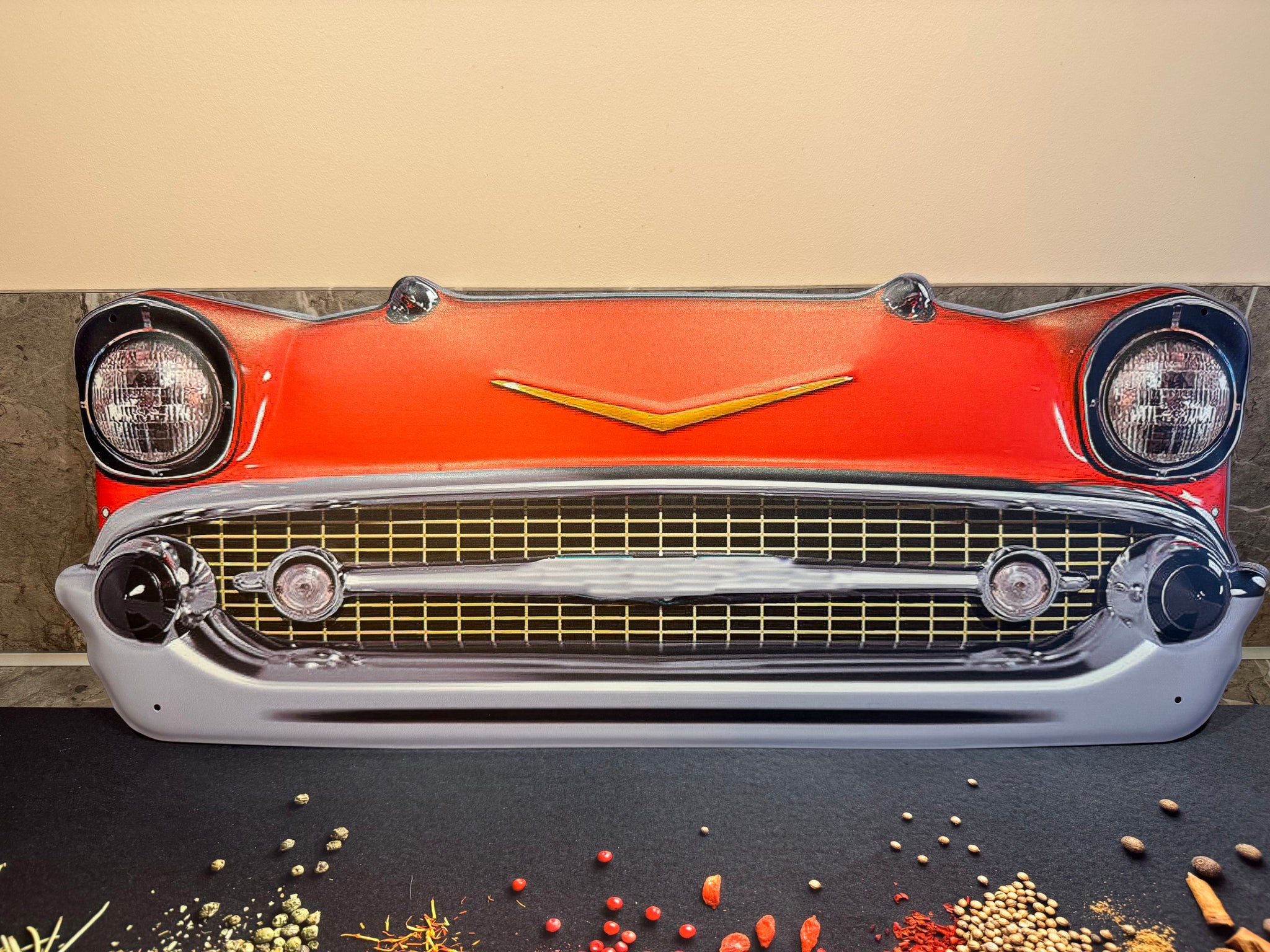Metalen wandbord van de voorkant van een klassieke rode Chevrolet Bel Air uit 1957. 27 cm hoog en 70 cm breed